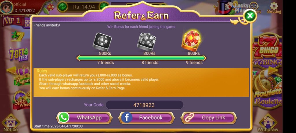 • Referral Bonus: Invite friends and earn up to 700 PKR per referral, plus a percentage from their lifetime wagers.